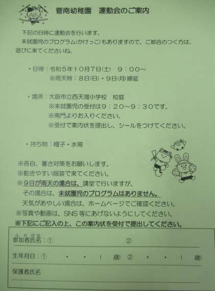 9月のさくらんぼクラブや幼稚園説明会に来られた方は、お渡しした案内状(写真と同じもの)にご記入の上、受付で提出してください。