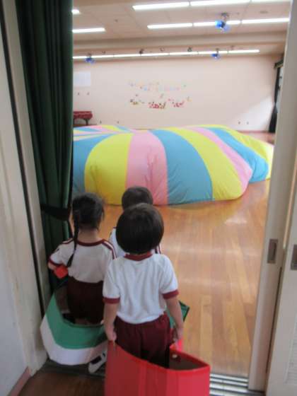 今日は、遊戯室から楽しそうな音楽が聞こえてきたので、近くに保育室がある3歳児が、5歳児のパラバルーンを見に行っていました。