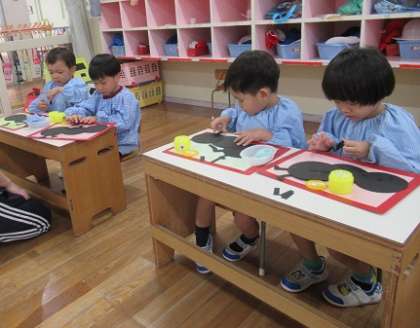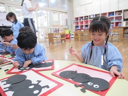 先生と一緒に、「1本指で少しずつ使うんだったね」とのりの使い方を確認し、丁寧につくる姿が見られました。「♪あっち行ってチョンチョン こっち来てチョン」とアリさんの歌を歌いながらつくっている子もいて、「できた!」「かわいい!」ととても満足気でした。