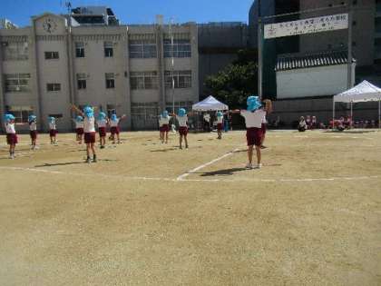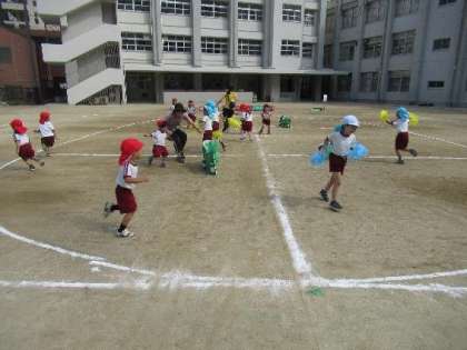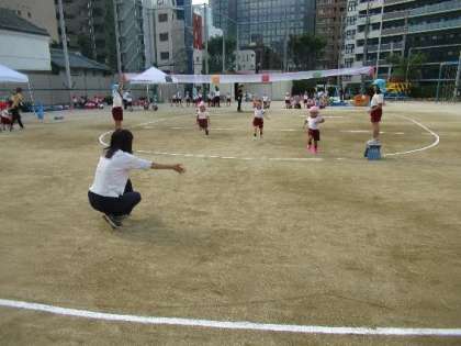 今日は西天満小学校の校庭で全園児で運動会の予行をしました。