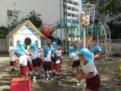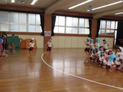 運動会で4歳児がしていた“玉入れ”を5歳児がしたり、5歳児がしていた“リレー”に4歳児が入れてもらって走ったりして遊んでいました。