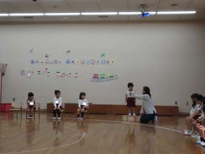 今日は、もも組(4歳児)が「これから、10月の誕生会をはじめます」と司会をしました。