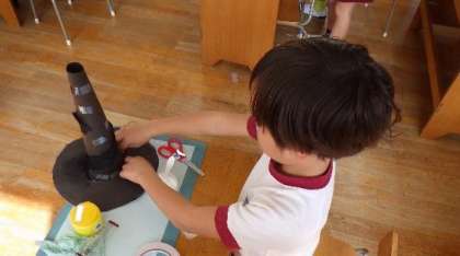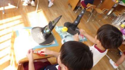 そら組さんは、今、「魔法の世界」に夢中です!今日は、自分だけの魔法使いの帽子をつくっていました。リボンやキラキラのテープや折り紙、布を使って「これは両面テープではつかないな」「ボンドでつけたらいいんじゃない?」と友達と相談しながらつくっていました。友達がつくっている様子を見て「かわいい!」「こんなの、よく考えたね!」とお互いを認める言葉がたくさん聞こえてきて、私たちもうれしい気持ちになりました。