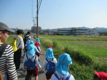 道中の田んぼから虫の声が聞こえたり、柿の木に実がなっていたりして、秋の自然を見つけながら楽しく歩きました。