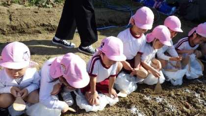 芋畑に着いたら、畑の方に挨拶をし、お芋ほりスタート!ちょっと顔を見せているお芋を見て、「よーし、掘るぞー!!」とやるきまんまんな子どもたちでした。