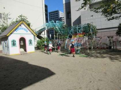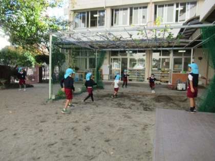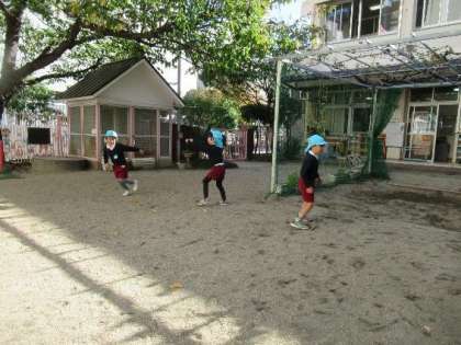 作品展に向けて、保育室で作品作りをすることも多いですが、今日はとってもいいお天気だったので、お外でも遊びました!朝晩は寒くなりましたが、お昼の園庭はとってもいいお天気!走り回って遊んでいた子どもたちは、「暑い!」と腕まくりをしたり、セーターを脱いだりして遊んでいました。少しいざこざが起こっても子どもたちだけで話し合って解決するする姿も見られるようになり、成長を感じました。たっぷり遊んで「明日は絵をかきたいな」「早く作品を完成させるぞー!」とかいたり、作ったりすることにより意欲的になるそら組の子どもたちでした。