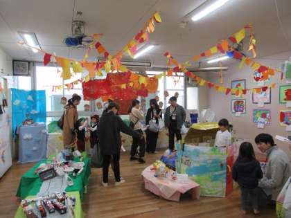 今日の作品展を心待ちにしていた子どもたちは、「これ見て!」「こっちは友達がつくったよ」などと園内を案内しながら、自分のがんばったところや楽しかったことなどを、とても誇らしげに、そしてとても楽しそうに、お話ししていました。