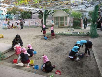 今日のさくらんぼクラブでは、いつものように5歳児が受付をし、4歳児も3歳児も一緒に園庭で遊びました。