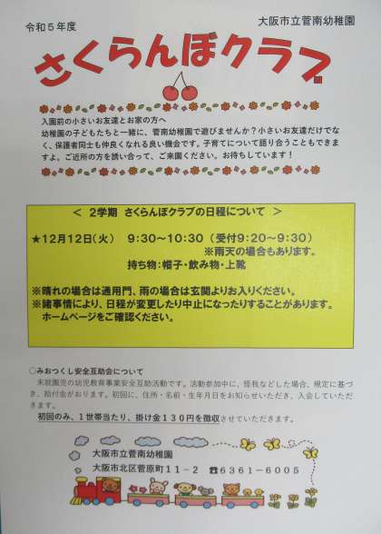12月のさくらんぼクラブについて 公開日 2023/11/27 更新日 2023/11/27 未就園児 次回のさくらんぼクラブは、 12月12日(火)9:30〜10:30の予定です。 【受付:9:20〜9:30です。】 ぜひ、遊びに来てくださいね! いいね(0)