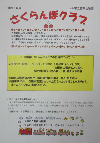 1月のさくらんぼクラブについて 公開日 2023/12/13 更新日 2023/12/13 未就園児 1月12日(金)さくらんぼクラブ(未就園児・園庭開放)があります。 幼稚園の子どもたちと一緒に遊んだり、体操をしたりします。 ぜひ遊びに来てくださいね。 いいね(0)