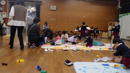 あいにくのお天気でしたが、遊びに来てくれた小さいお友達と遊具で遊んだり、先日の生活発表会で歌った歌を聞いてもらったり、最後はみんなで『たこやき体操』をしたり…とても楽しく過ごすことができました。