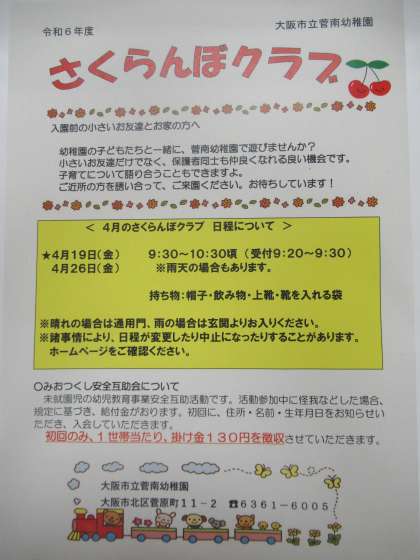 菅南幼稚園では、さくらんぼクラブ(未就園児園庭開放)を行っています。