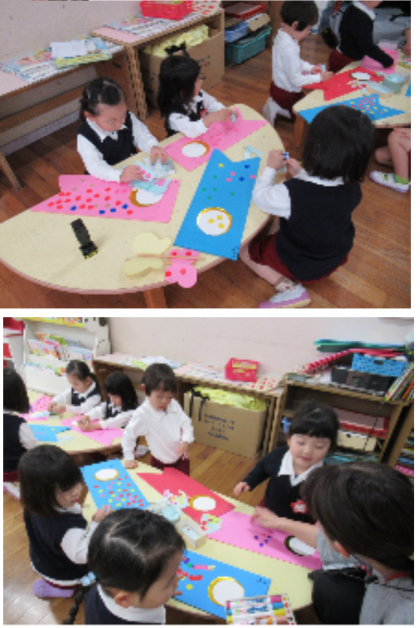 好きな色の画用紙にシールをはって、自分のこいのぼりをつくったりもしています。