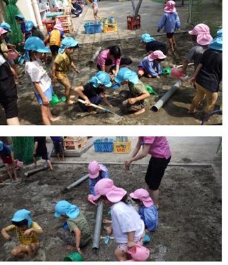 まだまだ暑い日が続き、園庭の暑さ指数とにらめっこをする日々ですが、朝晩は心地よい秋風を感じるようになりしたね。今日は、今年度最後の泥遊びをしました。初めは濡れたり汚れたりすることに慎重だった子どもたちも、日に日にダイナミックに遊ぶようになり、泥んこセットの着替えがびしょ濡れになるほどになりました。色水遊びや泡遊びもたくさん楽しみました。そら組さんは幼稚園で最後の泥遊び、たくさん遊んで嬉しそうな笑顔がとてもかわいかったです!