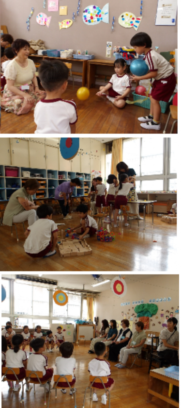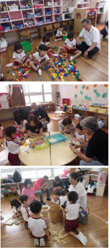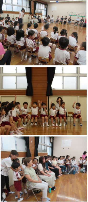 「誰のおばあちゃん?」「どこから来たん?」「万博、行った?」などと、友達のおじいちゃん・おばあちゃんにも親しみをもって話しかける姿が見られ、保育室の遊具で一緒に遊んだり、遊戯室に集まってみんなで歌を歌ったりしました。
