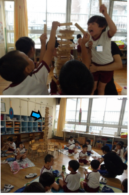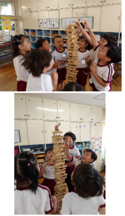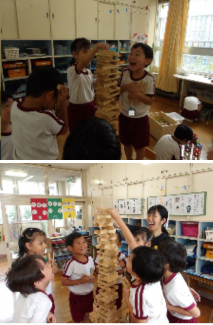 先生より大きい!!(そら組) 公開日 2025/09/11 更新日 2025/09/11 記事 子どもたちが積み木を積み上げて遊んでいました。 だんだん高くなってくると「見て!35階!」「届かへん!」「先生より大きいやん!」「待って!そーっとせな倒れる!!」・・・と大興奮!! みんなが集まってどんどん積み上げ、教師よりも背の高いタワーができました。 子どもたちの希望で、タワーと一緒にお弁当を食べていました(^^) いいね(0)