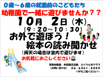 さくらんぼクラブのお知らせ 公開日 2025/09/16 更新日 2025/09/16 未就園児 次回のさくらんぼクラブは、10月2日(木)です。 たくさん体を動かして、一緒に遊びましょう! ぜひ、遊びに来てくださいね。 いいね(0)
