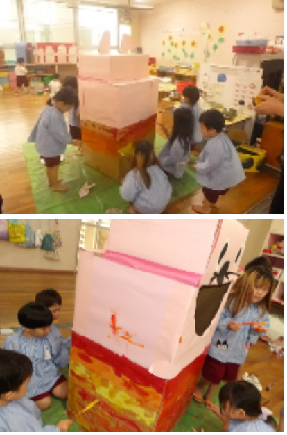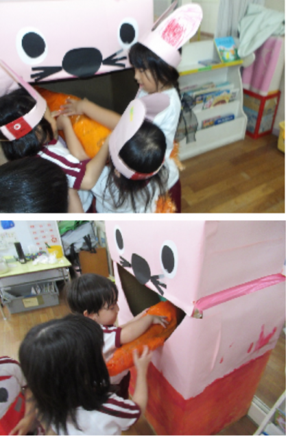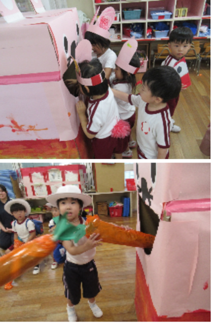 ニンジンどうぞ♪ 公開日 2025/09/20 更新日 2025/09/19 記事 ウサギさんになって遊んでいるあか組の子どもたち。 かわいい耳を着けて、お部屋で遊んだり、かくれんぼしたりしています。 みんなでつくった“大きなウサギさん”に“大きなニンジン”を食べさせてあげるのも、とっても楽しそうです いいね(0)