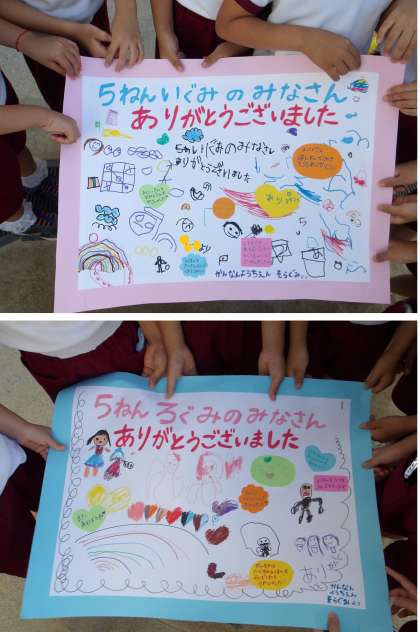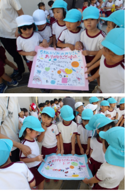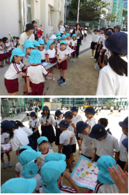 お兄さん・お姉さんありがとう! 公開日 2025/10/09 更新日 2025/10/09 記事 先日、絵本の読み聞かせをしてくれた5年生のみなさんが、子どもたちに会いに来てくれました。 そら組から『絵本を読んでくれてありがとう』のお手紙を渡すと、「かわいい♪」「ありがとうって書いてある!」と、にこにこしながら読んでくれていました。 いろいろな交流を通して、お互いに親しみをもってかかわっている様子が、とてもかわいかったです(^^) いいね(0)