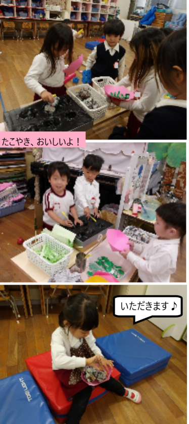 ネギがたっぷりかかった大きいたこ焼きをつくって、友達と一緒にたこ焼き屋さんごっこを楽しんでいます。