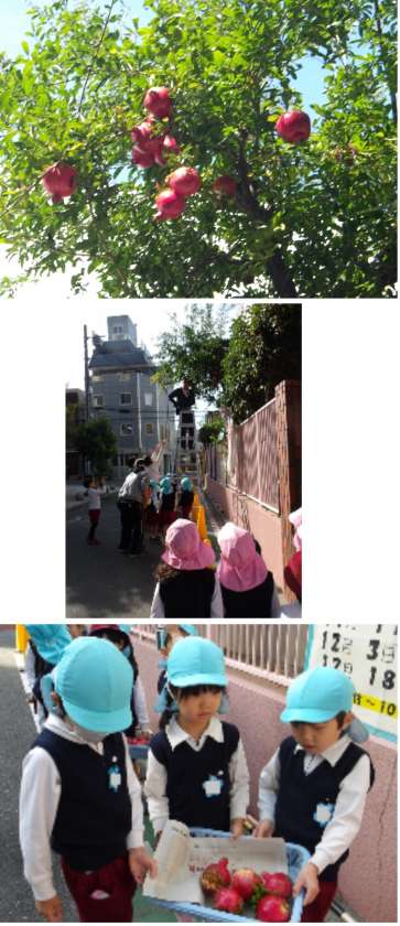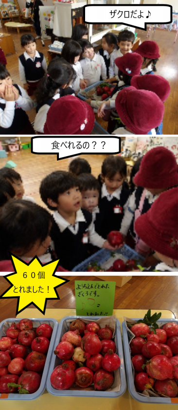 これ、なあに? 公開日 2025/10/31 更新日 2025/10/30 記事 今日は、幼稚園にあるザクロを収穫しました。 そら組さんが収穫のお手伝いをしていると、あか組さん、もも組さんも興味津々! 「これは“ザクロ”だよ」「いいにおいがするよ」とそら組さんが教えてあげていました。 『なんこあるのかな?』と並べて数えてみると、なんと60コもありました。 「みんなの分、あるね!」ととても嬉しそうな子どもたちでした。 いいね(0)