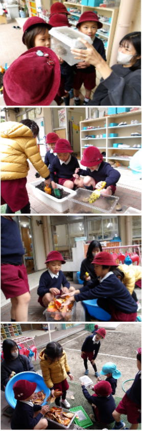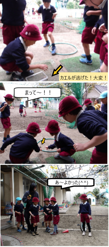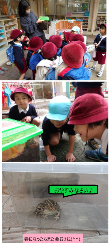 カエルさんの冬支度 公開日 2025/11/27 更新日 2025/11/27 記事 だんだんと寒くなってきたので、みんなでカエルの冬支度をすることにしました。 “カエルさんが寒くないように…”と、飼育ケースに土と葉っぱのお布団をたくさん入れてくれた子どもたち。 途中、カエルが跳び出した時には「逃げた!」「待って〜」「つかまえて!!」と、大騒ぎになりましたが、無事に冬のお家に引っ越すことができました。 いいね(0)