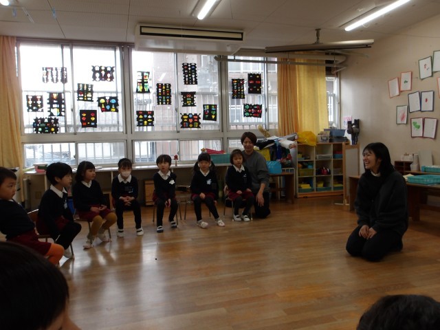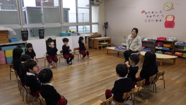 クラスのみんなでもう一度「あけましておめでとうございます!」とあいさつをしました。お友達の顔を見回して嬉しそうな子どもたちでした。遊戯室での始業式で、園長先生が、「冬休みの間に大きくなったね」と言ってくださり、その大きくなった姿を、後ろの保護者の方に見てもらいましょう!と後ろを向く時の子どもたちの誇らしげな顔がとてもかわいかったです。
