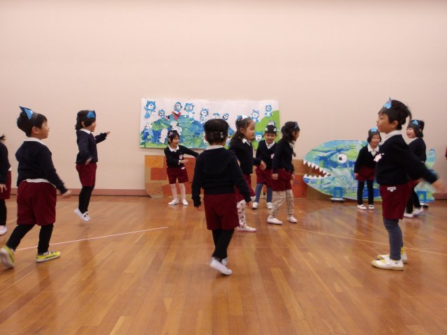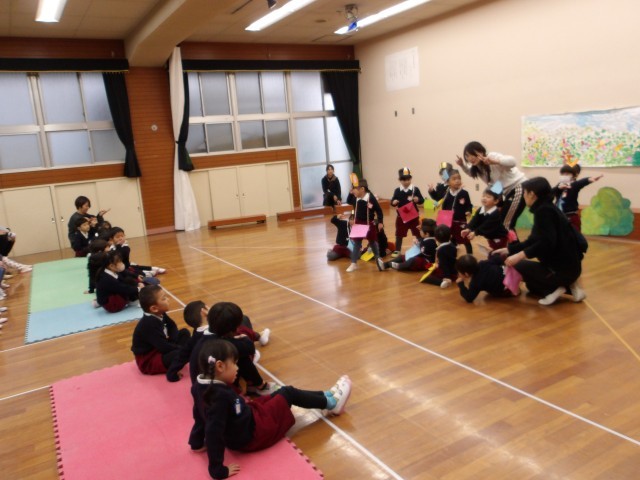 今日は今まで各クラスで遊んでいた劇遊びや合奏を見せ合いました。あか組、もも組は劇遊びを、そら組は合奏をしましたよ。たくさんのお友達に見られて恥ずかしそうだけれども、嬉しそうな子どもたちでした。