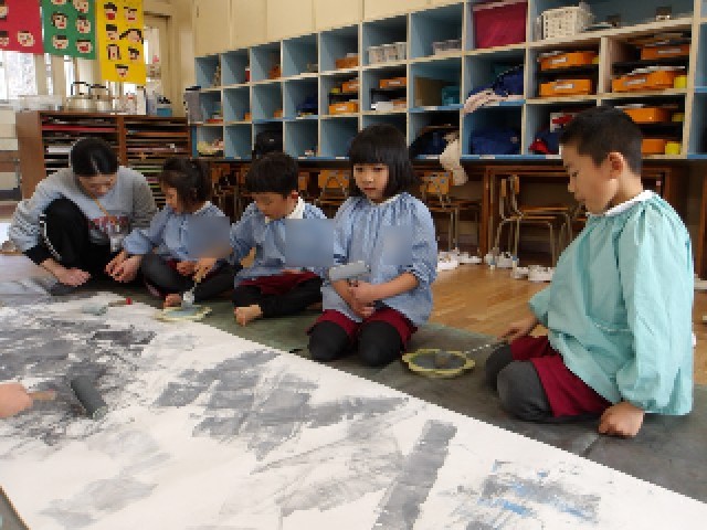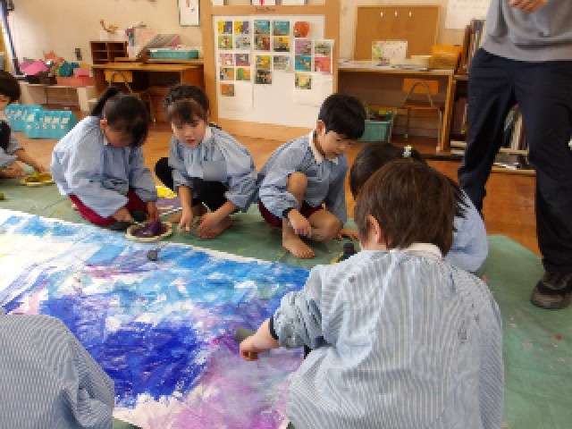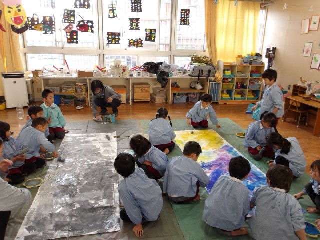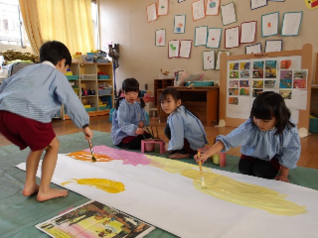 みんなでつくろう!! 公開日 2026/01/29 更新日 2026/01/29 記事 そら組の子どもたちがローラーや刷毛、のっぽ筆などを使って、絵の具で色を塗っていました。今遊んでいる『そんごくう』の劇で使う背景や大道具をつくっているそうです。劇も道具づくりも、みんなで力を合わせて、がんばったり楽しんだりしています(^^) +2 いいね(4)