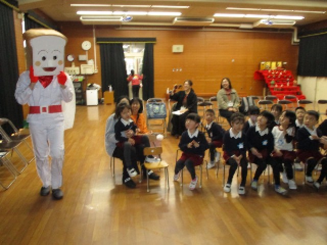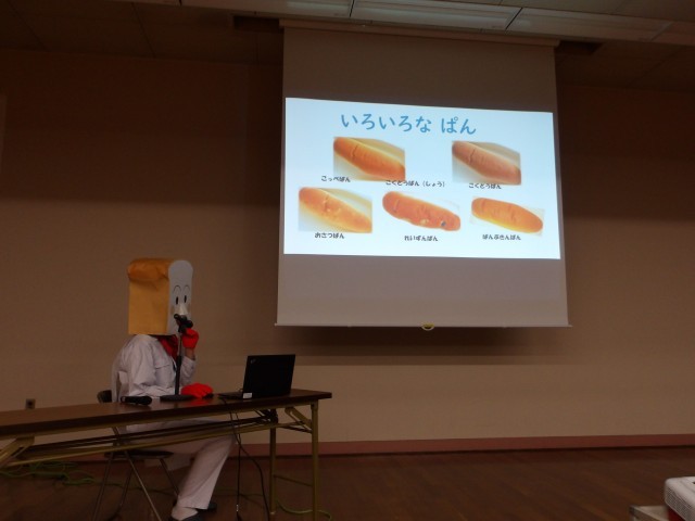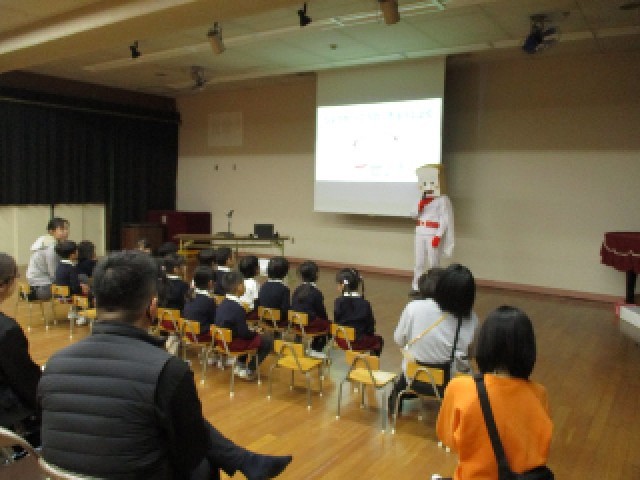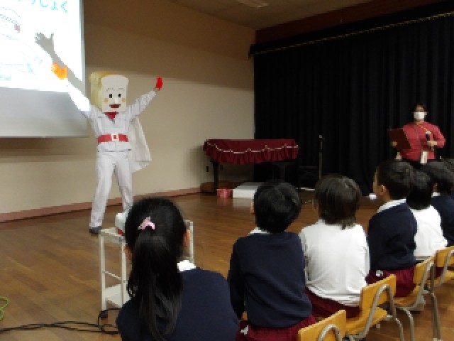 アニメのキャラクターに扮した先生と、給食に出てくる食べ物や食器などについてのクイズをしたり、給食の配膳の様子を写真で見たりしました。