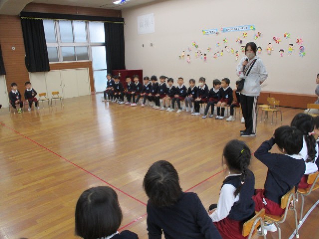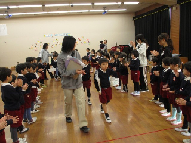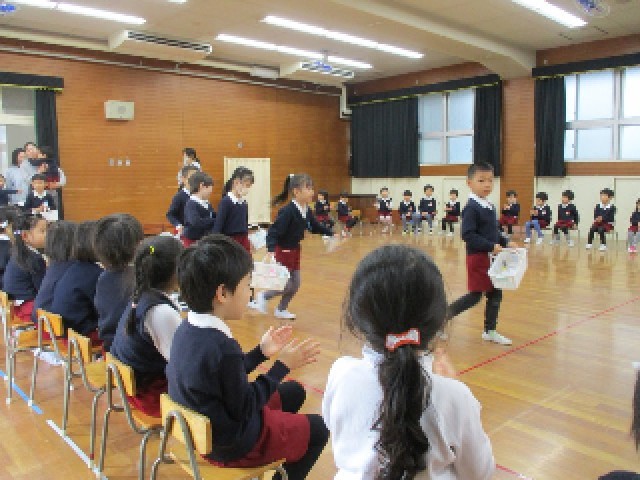 あか組・もも組の子どもたちに拍手で迎えられて入場したそら組さん。