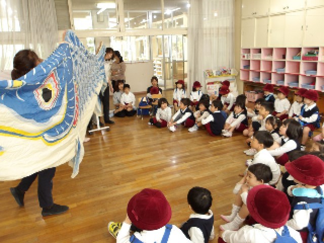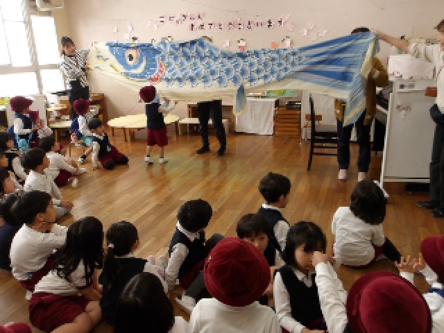 「これがこいのぼりだよ♪」と、先生がこいのぼりの大きな鯉を連れてくると、子どもたちは興味津々!