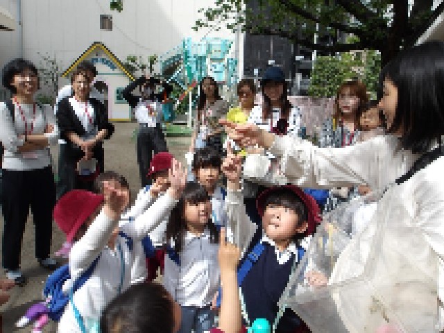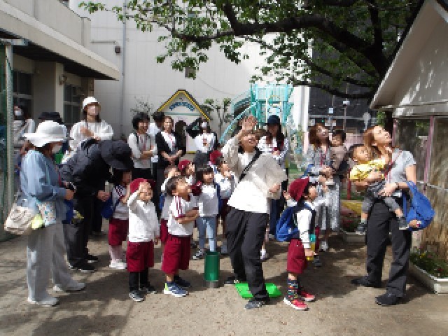 チョウチョが飼育ケースから出ると、「ばいばーい!!」「またねー!!」とみんなで手を振って、空高く飛んでいくのをいつまでも見送っていました(^^)