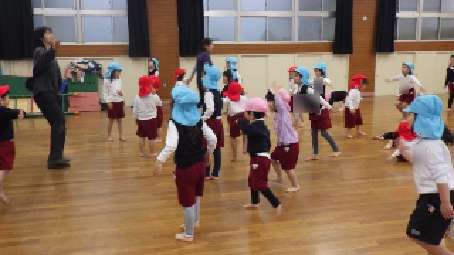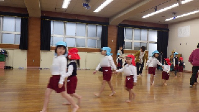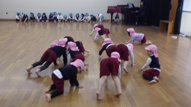 今日はみんなで遊戯室で遊びました。先生のピアノの音に合わせて、歩いたり、走ったり…いろいろな動きをしました。