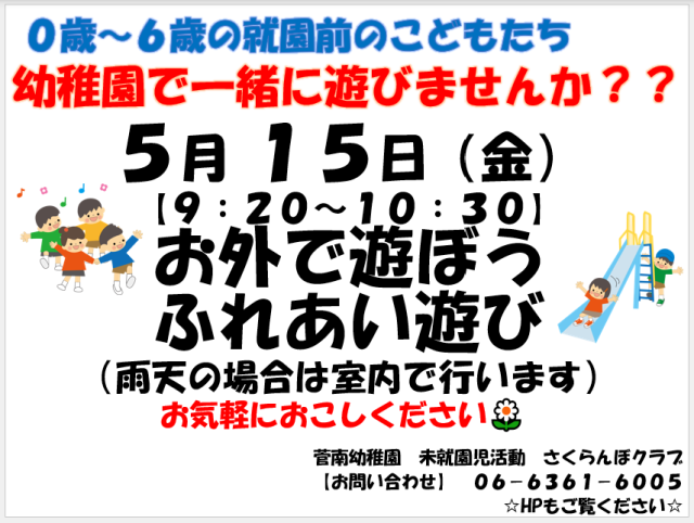 園庭で元気いっぱい遊んだり、ふれあい遊びをしたりする予定です。