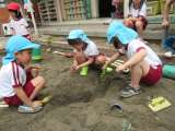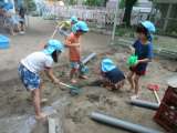 年長児が砂場を掘っていると、遊具が出てきました。 昨日のどろんこあそびで、埋もれ...