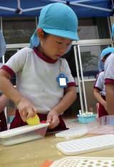 5歳児は、石鹸をすりおろして削り、そこに少量の水を入れてシャカシャカ泡立てて、泡...