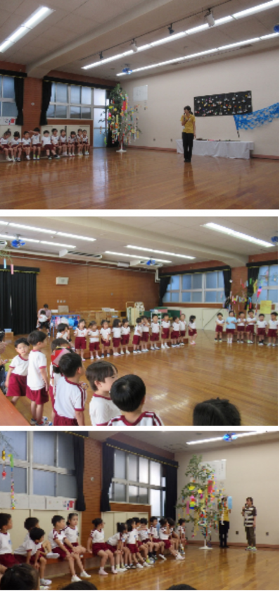 今日は、みんなで遊戯室に集まって、七夕の集いをしました。 子どもたちがつくった笹...