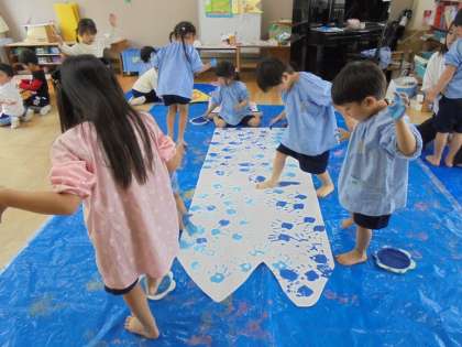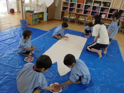 ぺたぺたぺったん!楽し〜い!!(4歳児) 公開日 2024/04/26 更新日 2024/04/26 日常の様子 朝、お部屋に真っ白なこいのぼりがやってきました。 園庭で泳いでいるこいのぼりみたいにしてあげよう!と、みんなで素敵な色をつけることにしました。 手と足をつかって、絵の具をぺたぺた、ぺったん!! 「ぼくの手形がいっぱいになったよ!」 「足でもやってみようっと!」 桃色と青色の、素敵なこいのぼりになりました☆ いいね(0) 4歳児