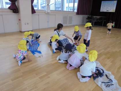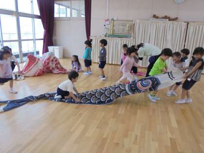 こいのぼり大きいな(3、4歳児) 公開日 2024/04/30 更新日 2024/04/30 日常の様子 いつもは園庭で空に向かって泳いでいるこいのぼり。 近くで見てみたい!と、ホールで見てみることにしました。 真鯉の大きさに「すごーーい!」と歓声をあげたり、目やうろこの模様に興味をもったりしながら、存分にこいのぼりとふれあって遊びました。 最後はこいのぼりと同じように、ホール中を力強く泳いでいましたよ♪ いいね(0) 3歳児 4歳児