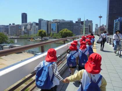 市役所へ行くまでの道では、川を通っている船に手を振ったり、橋を渡って興奮したりと、大阪の街並みを楽しく歩いている様子でした。