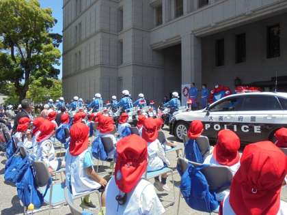大阪市役所正面玄関にて、交通安全の話を聞いたり白バイやパトカーの出発式を見たりして、交通ルールを守る意識も高まりました。