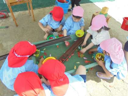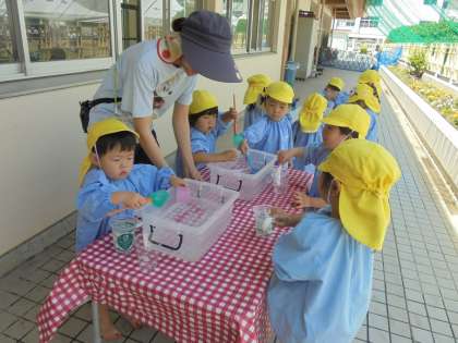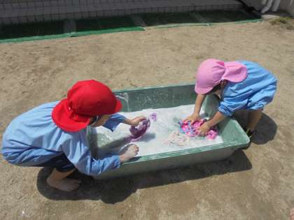 おみず だいすき! 公開日 2024/05/21 更新日 2024/05/21 日常の様子 気温がだんだん高くなってきたので、幼稚園では水遊びを少しずつ楽しんでいます。 スーパーボールすくい、色水遊び、洗濯ごっこなど、どの遊びも水の気持ちよさをたくさん感じていました♪ カップに水を入れるだけでも、子どもたちにとっては素敵な遊びです! 「きらきらジュースだよ!先生 どうぞ!」 太陽の光に反射して、キラキラ光るジュースができあがりました! いいね(0) 3歳児 4歳児 5歳児