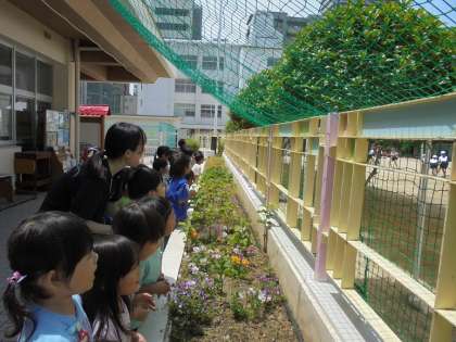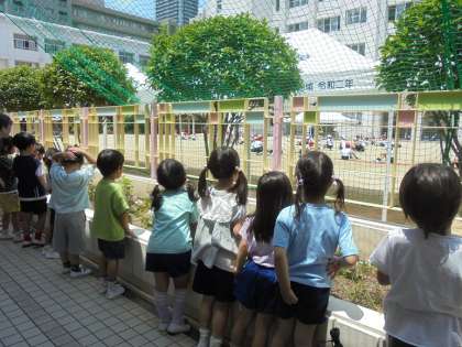 綱引きをしている様子を、ばら組が幼稚園から見ていました。
