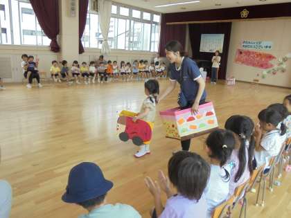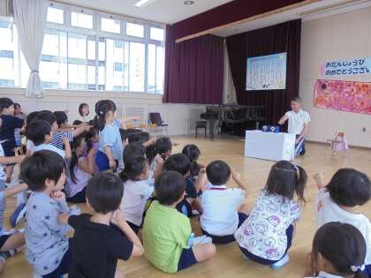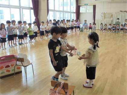 ばら組が手作りプレゼントを渡したり、みんなで体操をしたりしながら、ゆったりとした誕生会を過ごしました。