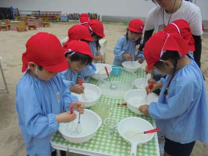 泡だて器を2個使ったり、速く混ぜたり、自分なりに工夫している姿もありました♪