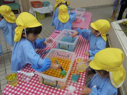 たんぽぽ組は、黄色や青色のきれいな色の水をすくったり流したりしながら、水のキラキラしたところを楽しんでいました。