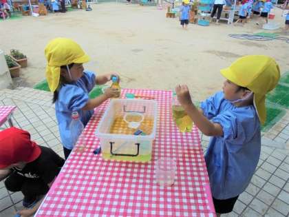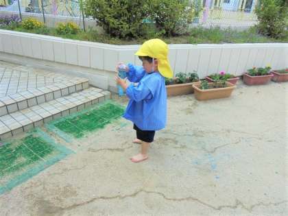 早速ペットボトルに喜んで色水を入れて遊んでいたところ、先生が穴の開いたキャップをくれました。