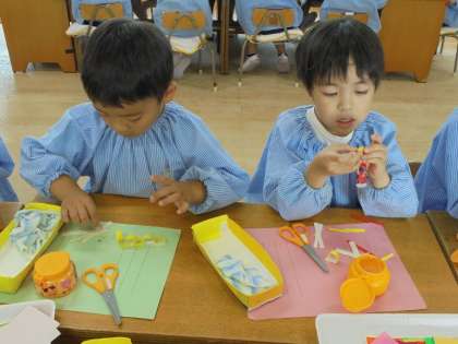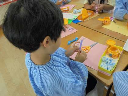 小さくて細い輪がたくさん(5歳児) 公開日 2024/06/14 更新日 2024/06/14 日常の様子 ばら組の子どもたちが、小さい折り紙を細長く折り、できた線に沿って切っていました。 小さくて細い紙をくるんと輪っかにして、輪つなぎをつくっていきました。 指先を細かく動かし、優しい力でつくっていかないと、すぐにちぎれてしまいます。 自分の手元を見ながら、がんばって取り組んでいました。 できた輪つなぎが何に変身したかというと・・・ お部屋の壁で、雨の飾りになりました♪ いいね(0) 5歳児