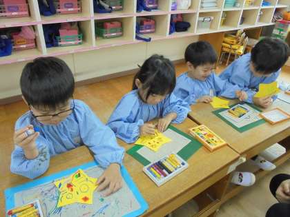 ぼくの星☆わたしの星☆(4歳児) 公開日 2024/06/25 更新日 2024/06/25 日常の様子 黄色い星形に、思い思いの絵をかきました。 自分の顔や友達、家族の顔をかいたり、好きな色でしっかりぬったりして楽しそうです☆ 「見て!僕のお星さまこんなのだよ!」 「私は笑っているお星さま♪」 たくさんのキラキラ星が、お部屋で生まれました☆ いいね(0) 4歳児